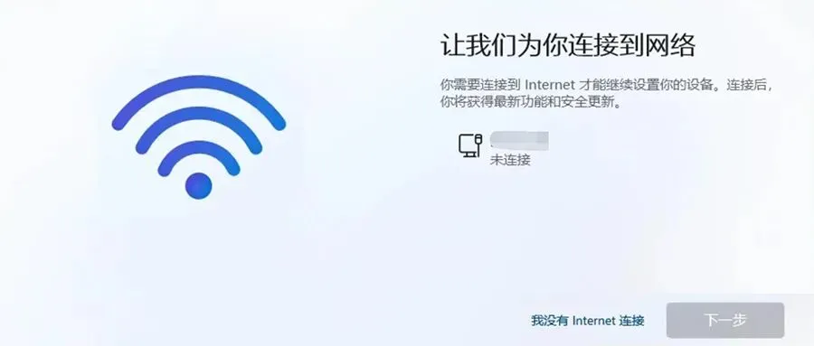 开机前,拔掉网线,关掉Wi-Fi开关(如果有的话) 正常开机,进入设置流程 到达“让我们为你连接到网络”页面时,啥也别动,干等20-30秒 神奇的事情发生了——页面右下角自动出现“我没有 Internet 连接”选项 点击它,选择“继续执行受限设置”,搞定!