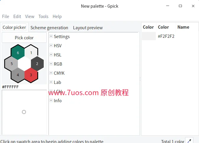 哦对了,如果你喜欢拖拽操作,Gpick也支持在调色板中拖拽颜色。按住Ctrl键可以改变颜色,Shift键则是移动颜色。在调色板里,你还可以选择不同的颜色槽来复制颜色。