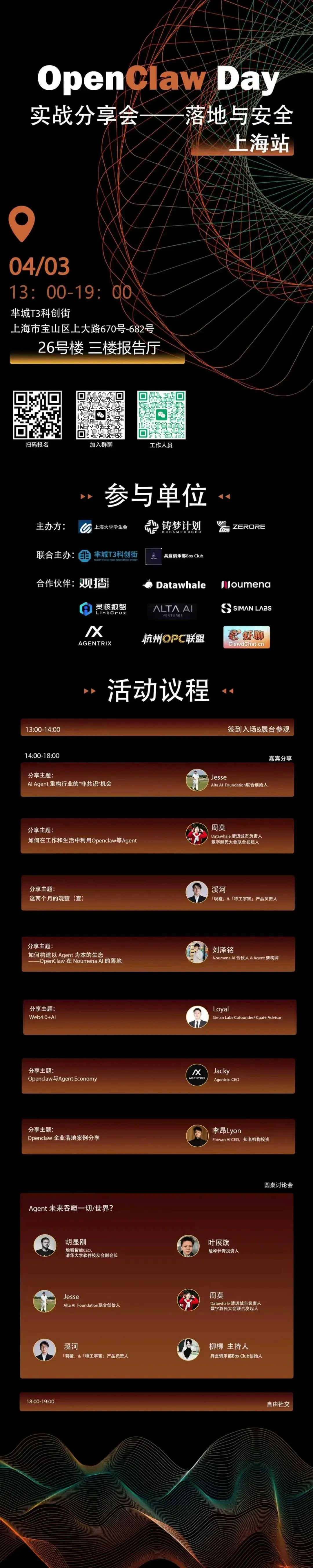 我们邀请已经将 OpenClaw 跑进业务流的先行者,每人 10-15 分钟,不讲套话,只秀 demo——现场演示他们的 Agent 怎么工作、解决了什么问题、踩过哪些坑。