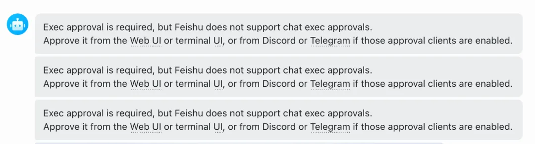 “Exec approval is required, but Feishu does not support chat exec approvals. Approve it from the Web UI or terminal UI, or from Discord or Telegram if those approval clients are enabled.”