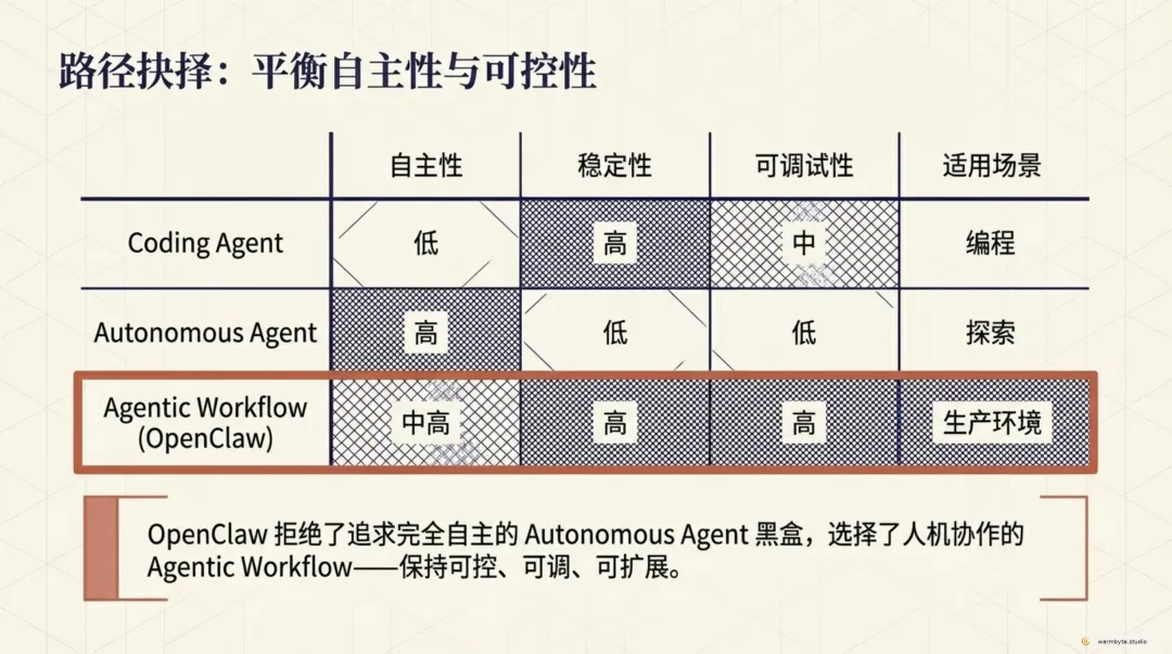 关键洞察:OpenClaw 追求的不是完全自主的 Agent,而是人机协作的 Agentic Workflow——保持可控、可调试、可扩展。