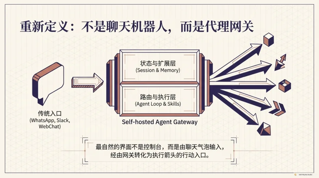 它不是聊天机器人,而是一个自托管的代理网关——把聊天入口、工具执行、记忆与工作区编成可运行的代理链路。