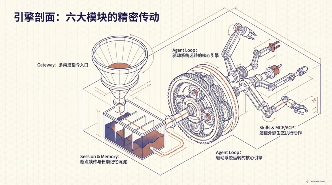 OpenClaw 把聊天入口、工具执行、记忆与工作区编成可运行的代理链路。
