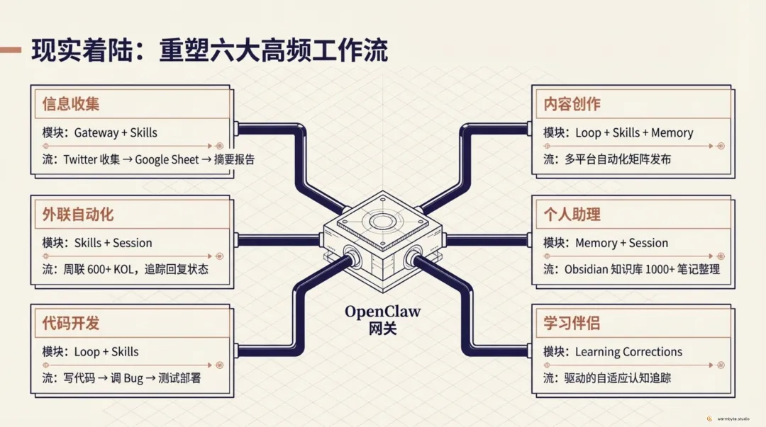 场景1:信息收集典型流程:从 Twitter/X、LinkedIn 抓取 → 自动整理到 Google Sheet → 生成摘要报告用户原话:“用 OpenClaw 之前,找 KOL 联系方式要一天;现在一小时搞定。”