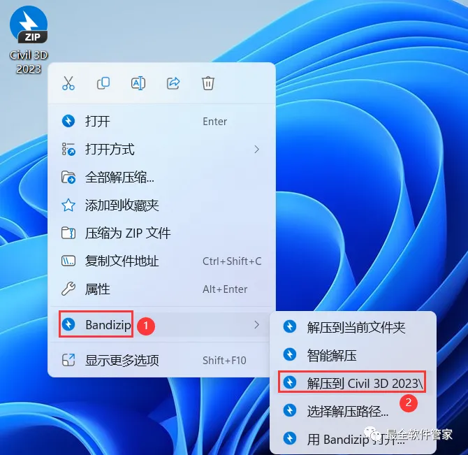 1、下载Civil 3D 2023软件安装包到电脑上,右键选择【解压到Civil 3D 2023\】