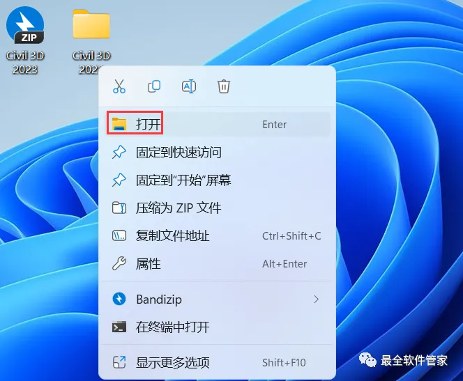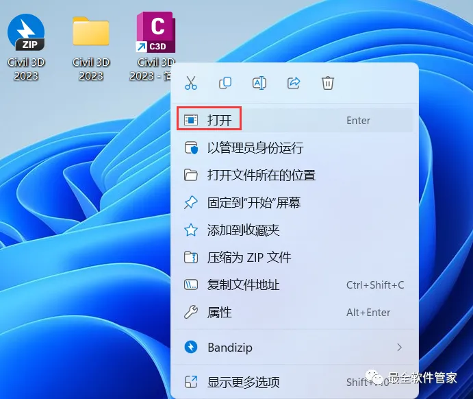 15、回到桌面,右键桌面上的【Civil 3D 2023软件图标】,点击【打开】