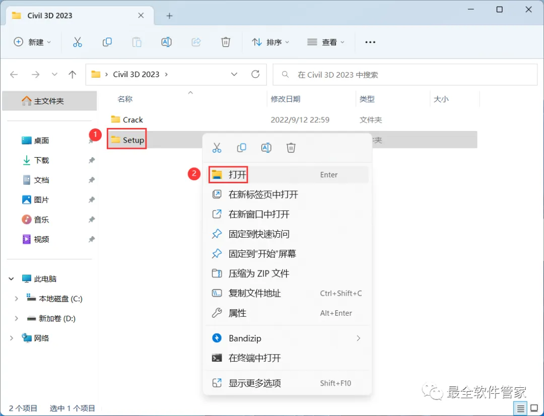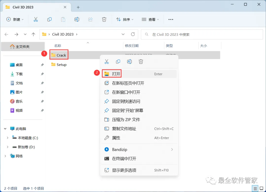 12、回到Civil 3D 2023文件夹,找到【Crack】文件夹,右键【打开】它
