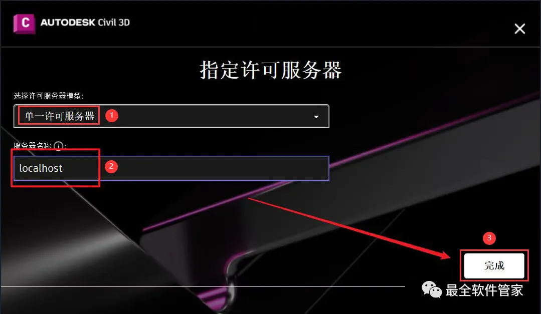 18、服务器模型选择【单一许可服务器】,服务器名称输入:127.0.0.1或localhost,再点击【完成】