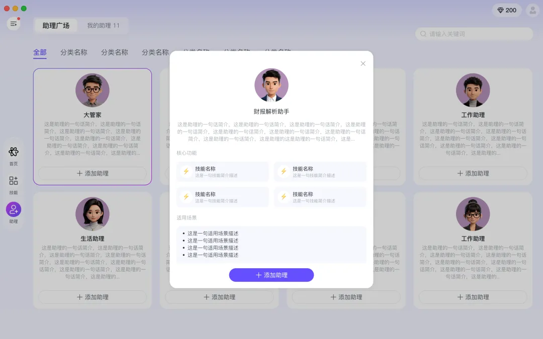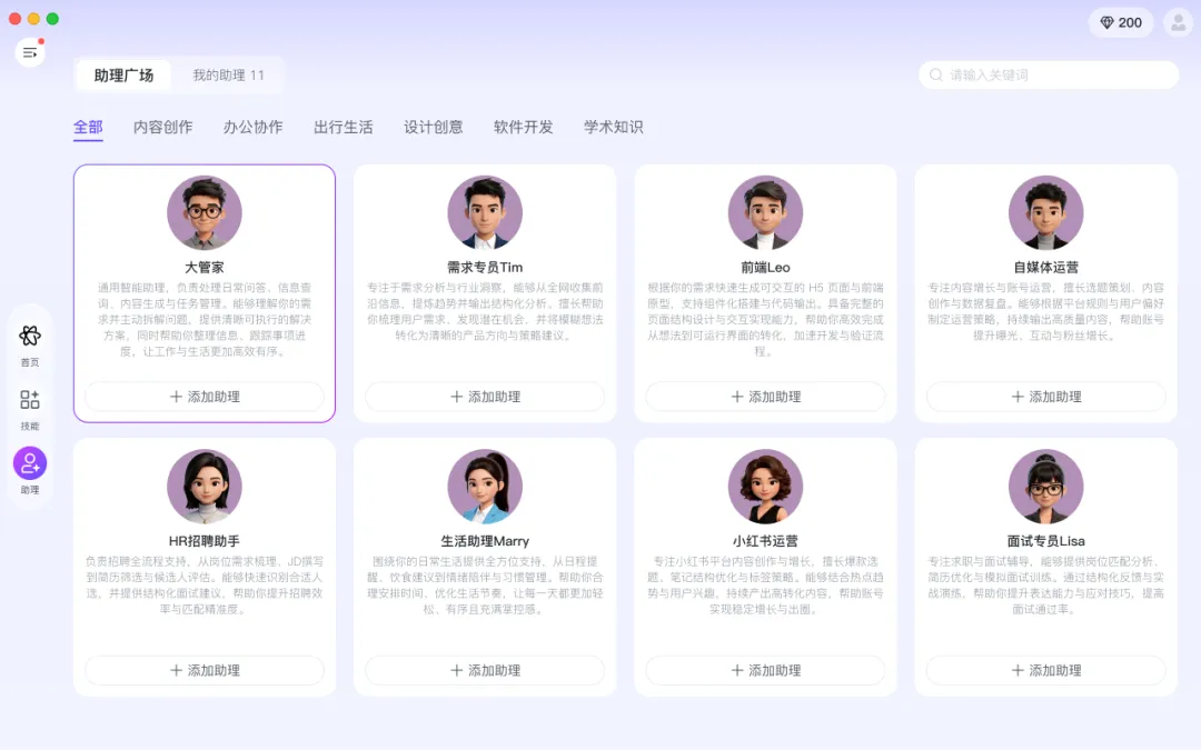 AI技能矩阵,内置5000+预置技能覆盖高频需求,支持自定义创建专属AI助理角色。