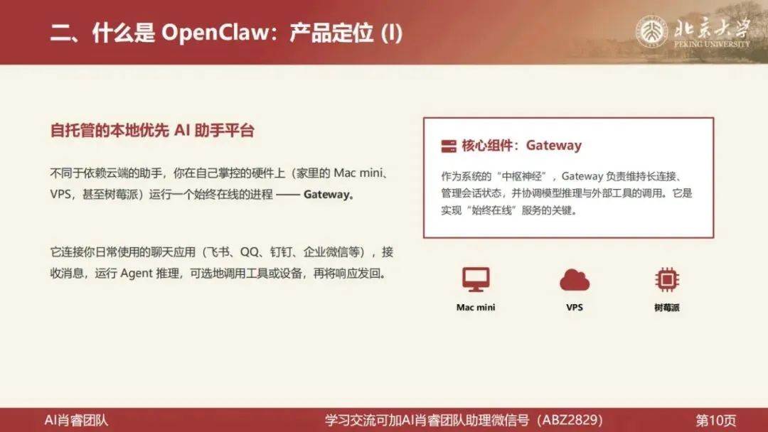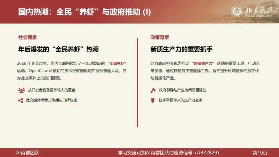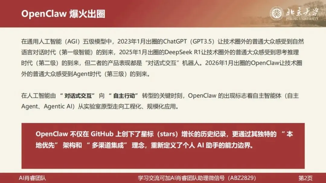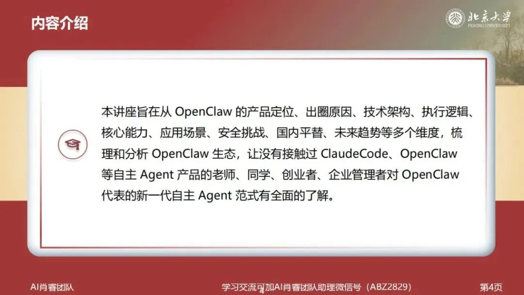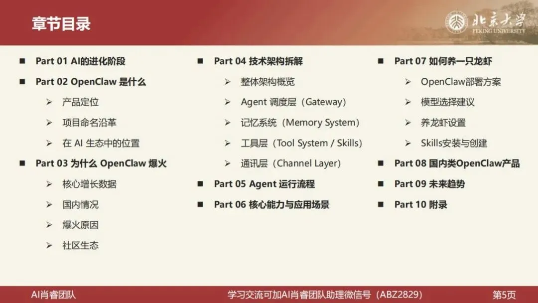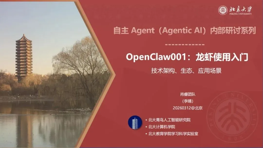 北京大学肖睿团队刚刚发布了一份81页的系统性讲座文档,题为《OpenClaw001:龙虾使用入门——技术架构、生态、应用场景》。报告面向没有技术背景的老师、职场人、创业者和企业管理者,是目前国内最完整、最易读的 OpenClaw 入门解析。