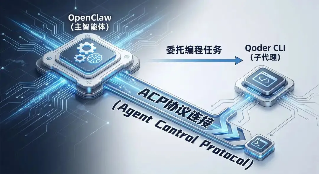 OpenClaw可以连接Qoder,并将编程任务委托给Qoder。这种连接通过ACP(Agent Client Protocol)协议实现,使OpenClaw能够作为主智能体调度Qoder CLI(Qoder的命令行工具)作为子代理执行编程任务。