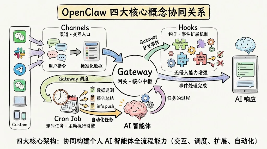 四个模块相互协同,共同构成了 OpenClaw 高可扩展、高可控、高灵活的核心架构,支撑了个人 AI 智能体从交互、调度、扩展到自动化的全流程能力。