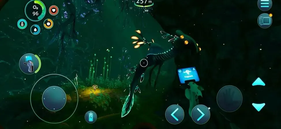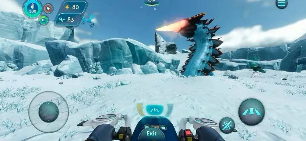**海陆双线探索+全新载具**:前作以深海为主,本作则是冰原与深海无缝衔接。你可以驾驶**雪狐号**悬浮摩托,在白雪皑皑的苔原上飞驰,穿越暴风雪抵达废弃科研站;也可以组装模块化的**海蛟号**潜艇,搭配不同舱段(载具舱、储物舱、实验室),深入扭曲之桥、水晶洞穴等全新深海区域,探索远古外星遗迹与阿尔特拉公司的秘密基地。生物也全面换新,有憨态可掬的冰企鹅(Pengwing),也有潜伏在黑暗中的**暗影利维坦**、会偷你道具的海猴子,极地生态链充满未知与危险。