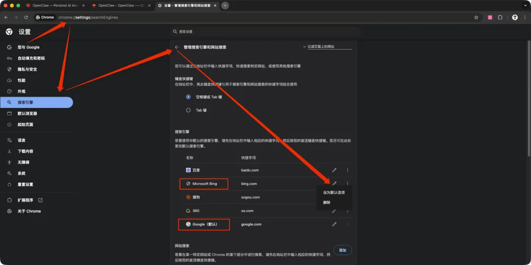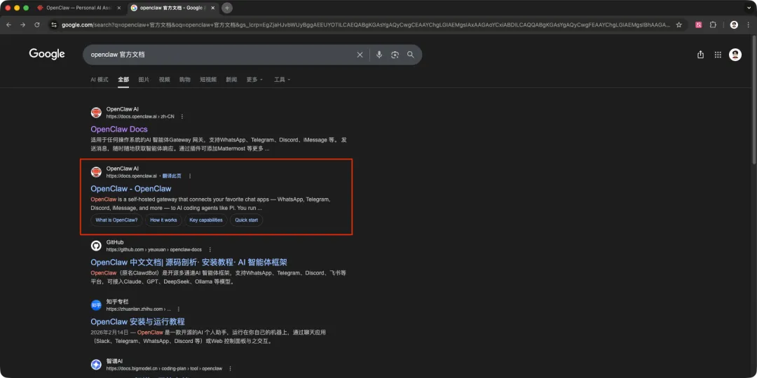 在浏览器搜索"工具名 + 官方文档",排名靠前的大概率就是。比如 OpenClaw 的官方英文文档就是搜索结果中的第二个。