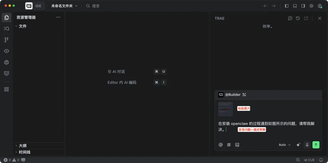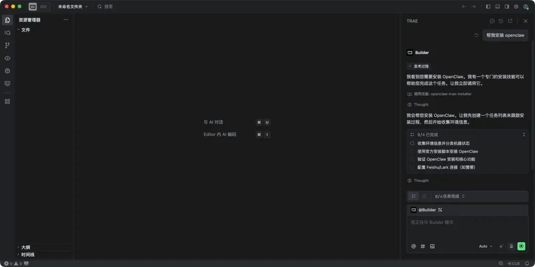 如果你对终端恐惧,是完全可以的,这也就是半自动方案:直接跟你的 Trae 说:“帮我安装 openclaw。”
