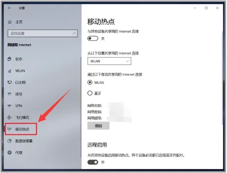 Win+I打开系统设置,点击网络和Internet,切换到移动热点,打开与其他设备共享我的Internet即可。