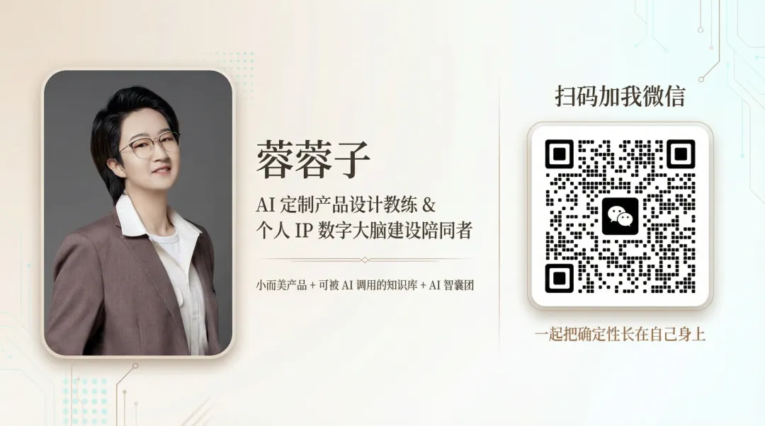 我是蓉蓉子,10 年+企业解决方案专家 &AI 企业赋能实践者,同时也是 AI 个人产品定制教练。
