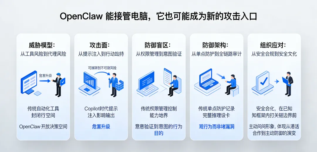 一、从“工具风险”到“代理风险”:威胁模型的根本升级 二、从“提示注入”到“行动劫持”:新型攻击面的现实威胁 三、从“权限管理”到“意图验证”:传统防御体系的失效边界 四、从“单点防护”到“全链路审计”:防御架构的重新设计 五、从“安全合规”到“安全文化”:组织层面的根本应对