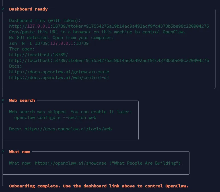 ./bin/openclaw config set "gateway.mode" "local"./bin/openclaw config set "gateway.bind" "lan"./bin/openclaw config set "gateway.controlUi.allowedOrigins" '["http://0.0.0.0:18789"]'./bin/openclaw config set "gateway.controlUi.dangerouslyDisableDeviceAuth" true