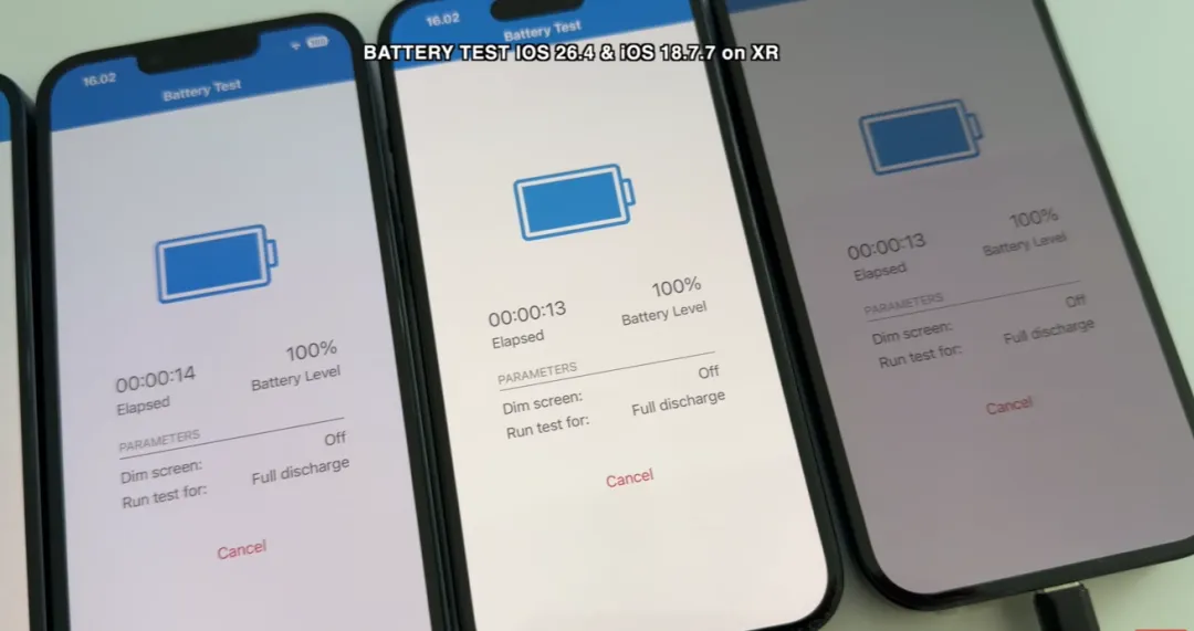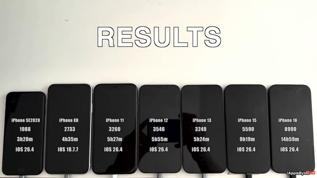 iOS 26.4续航测试来了,升级需谨慎~本周三,苹果发布了iOS 26.4正式版等多个系统更新,相信不少果粉都已经进行了升级,不知道大家升级到iOS 26.4正式版后感觉续航如何呢?每每有新的iOS版本发布,评论区的果粉们对于新系统的续航都是褒贬不一,这次依旧如此。从油管博主iAppleBytes的续航测试来看,各iPhone的表现参差不齐,一起来看看吧~本次参加续航测试的机型依旧是:iPhone SE2、iPhone XR、iPhone 11、iPhone 12 、 iPhone 13、iPhone 15以及iPhone 16机型。其中,由于iPhone XR机型无法更新至iOS 26系统,参与测试的系统为苹果刚发布的iOS 18.7.7正式版。续航测试的过程也跟之前一样,在iPhone电池满电的情况下,将屏幕亮度调制相同,接着直接用知名跑分软件Geekbench4进行续航消耗测试....各iPhone在升级iOS 26.4正式版的续航测试结果如下:如果对比之前的iOS 26.3.1正式版的续航测试,iPhone SE2和iPhone 13的续航都缩减了不少,而iPhone 11和iPhone 16续航则大幅增长。当然,考虑每次测试的结果都不会是一样的,几分钟甚至十几分的续航差都可以忽略不计,包括这位博主分享的续航测试也只是仅供参考,iOS 26.4正式版续航到底如何,还是要以自己实际体验为准。如果你不想升级iOS系统,又不想被iOS系统的更新提示打扰,可以在咱们公众号:果粉之家 回复「屏蔽」获取屏蔽iOS系统更新的描述文件,按照提示安装后,就可以屏蔽iOS系统更新了。建议大家在升级iOS 26系统之前一定要慎重考虑好,特别是老系统的iPhone用户,一旦升级,就无法再降级回原来的旧系统了。iPhone17已经上市,256GB起步,6.3寸更大屏幕,120HZ高刷等良心升级,今年肯定会大卖!如果您家里有闲置手机趁现在高价出掉,很多人把闲置的手机一直放着,最后只能换不绣钢脸盆!(估价满意后再加回收专员:gfzjxm)