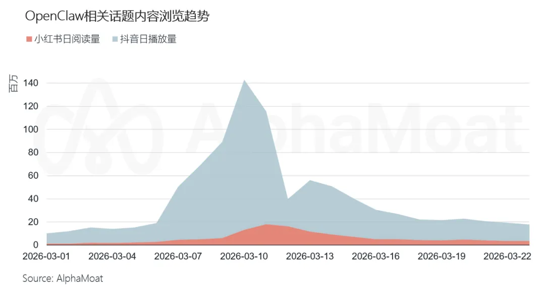这场热度不只在开发者社区蔓延:根据AlphaMoat统计,截至2026年3月24日,抖音平台OpenClaw相关内容总播放量超过8.9亿次,3月10日单日播放量近1.3亿次。小红书平台,同一话题浏览总量超过1.5亿次,近30天互动数超400万,3月11日单日浏览增量突破1800万。这是一个已经从 GitHub 破圈到大众消费内容的现象级产品。