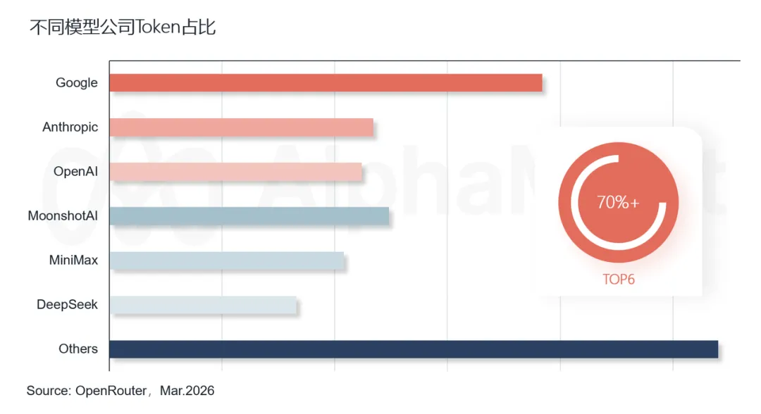 AlphaMoat 调取的 OpenRouter 流量数据显示,OpenClaw 爆火后的两个月里,Claw生态产品最密集的战场——Programming 和 Marketing两个应用方向的模型集中度均在快速收窄。如果把视野拉到所有应用场景,2026年3月数据显示,前六家大模型公司合计吃掉约 72% 的全局 token——Google 统治内容创作场景,Kimi+MiniMax 统治代码场景。