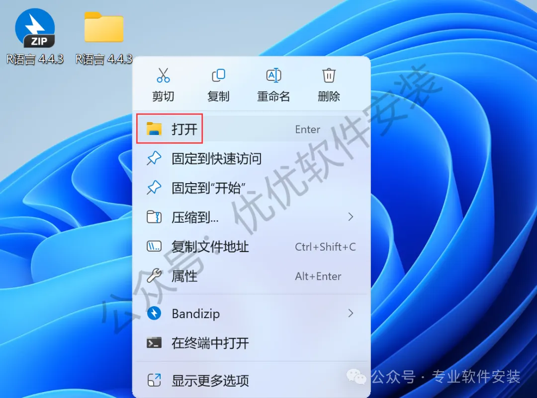 13、回到桌面,右键桌面上的【R 4.4.3软件图标】,点击【打开】