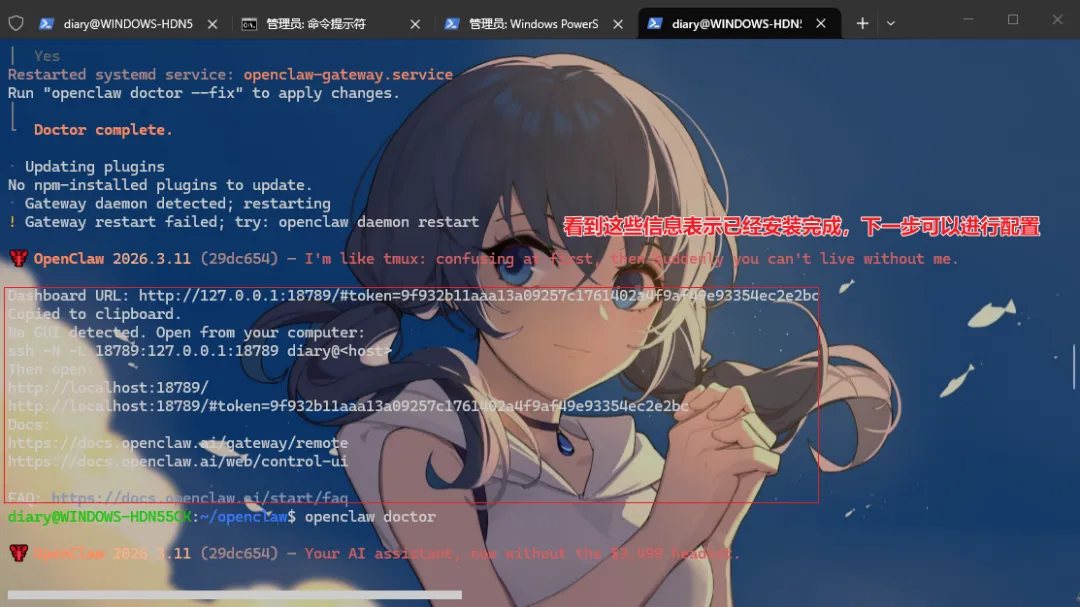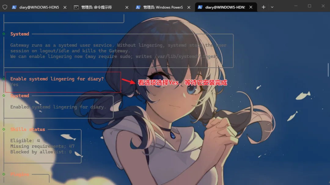 wsl -d Ubuntu # 进入WSL系统systemctl --user status # 查看设置状态,能看到正常输出则表示成功三、以管理员身份运行:WSL终端,切换到:/home/用户名(具体看你上面创建的用户名,我这里是diary),直接运行下面的一键安装OpenClaw命令: