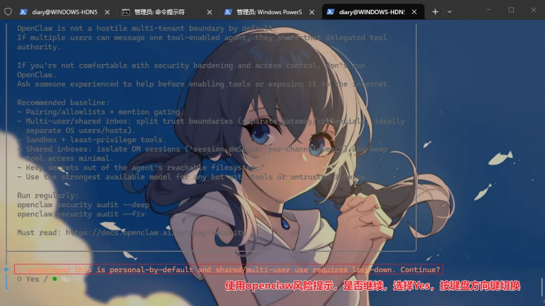 3、这一步主要是告诉你,使用OpenClaw可能会有一些风险。请问你是否继续? 按 向左方向键 ←,选择 Yes,按 Enter 回车确认
