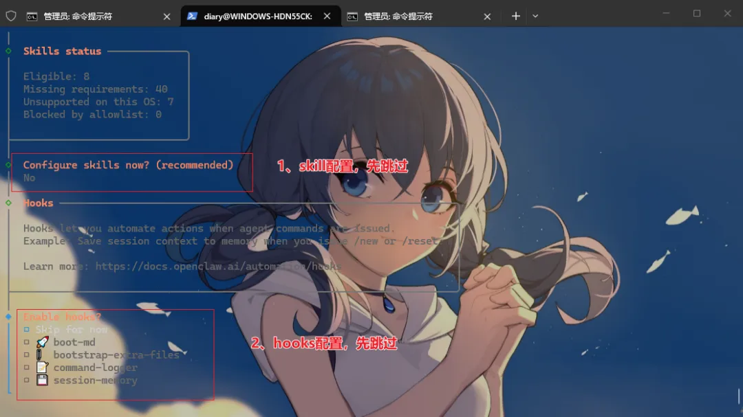 7、skill和hooks(钩子,高级功能,用于在启动时加载文档、记录日志等)配置:先Skip for now跳过,后续再进行配置