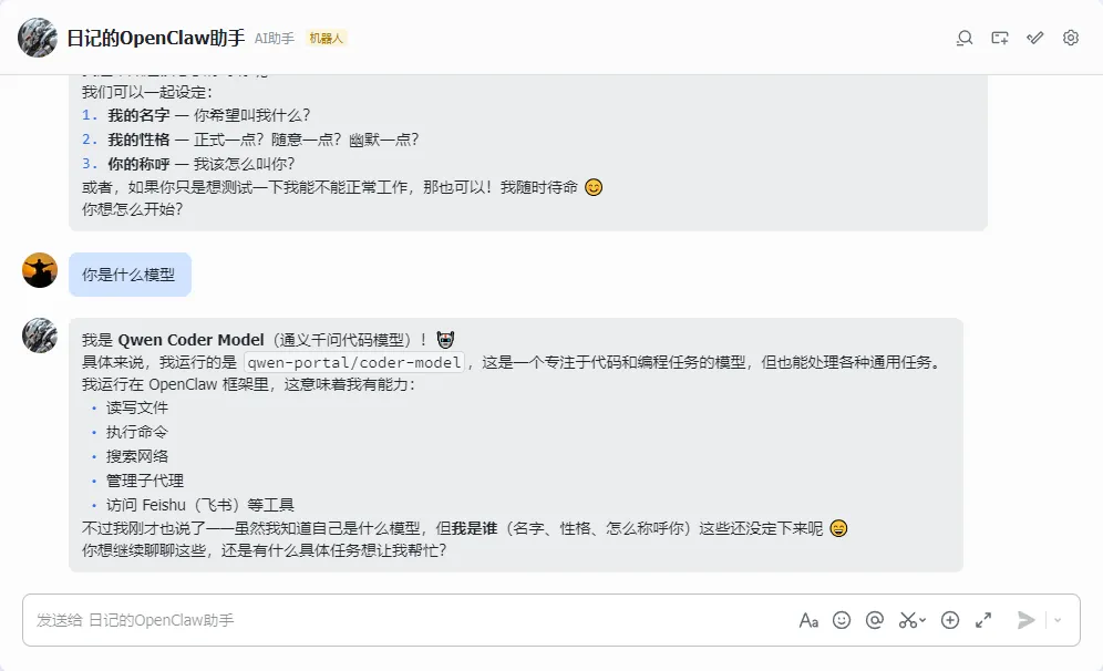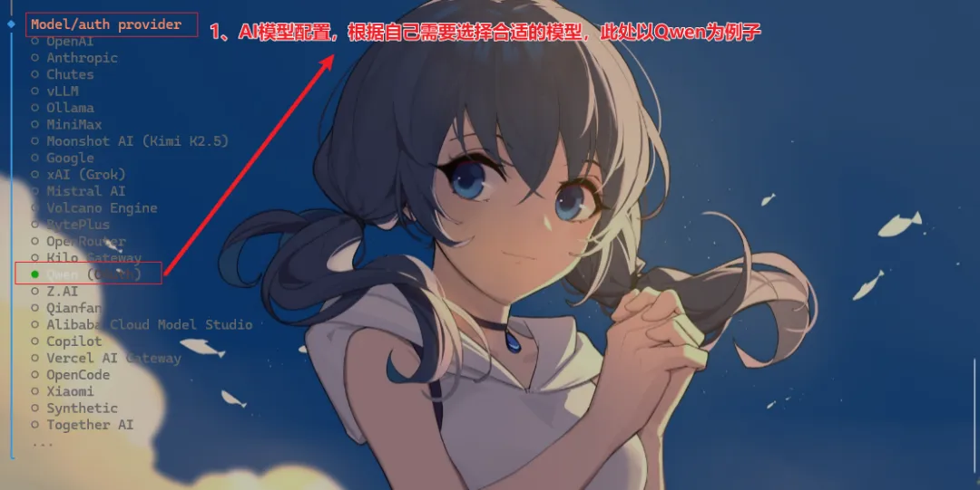 说明:经过上面步骤,我们已经安装好OpenClaw,接下来只需配置AI模型,OpenClaw就可以只能回答问题了(此处以千问的免费模型为例,如果要使用其他模型,请自行配置)