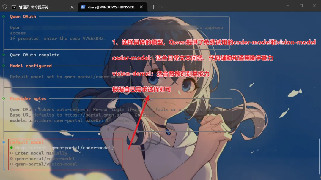 qwen-portal/coder-model:千问的免费模型,适合日常文本问答、代码辅助和通用助手能力