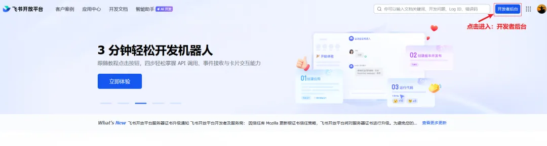 1、登录飞书开放平台:https://open.feishu.cn/?lang=zh-CN,并进入开发者后台界面