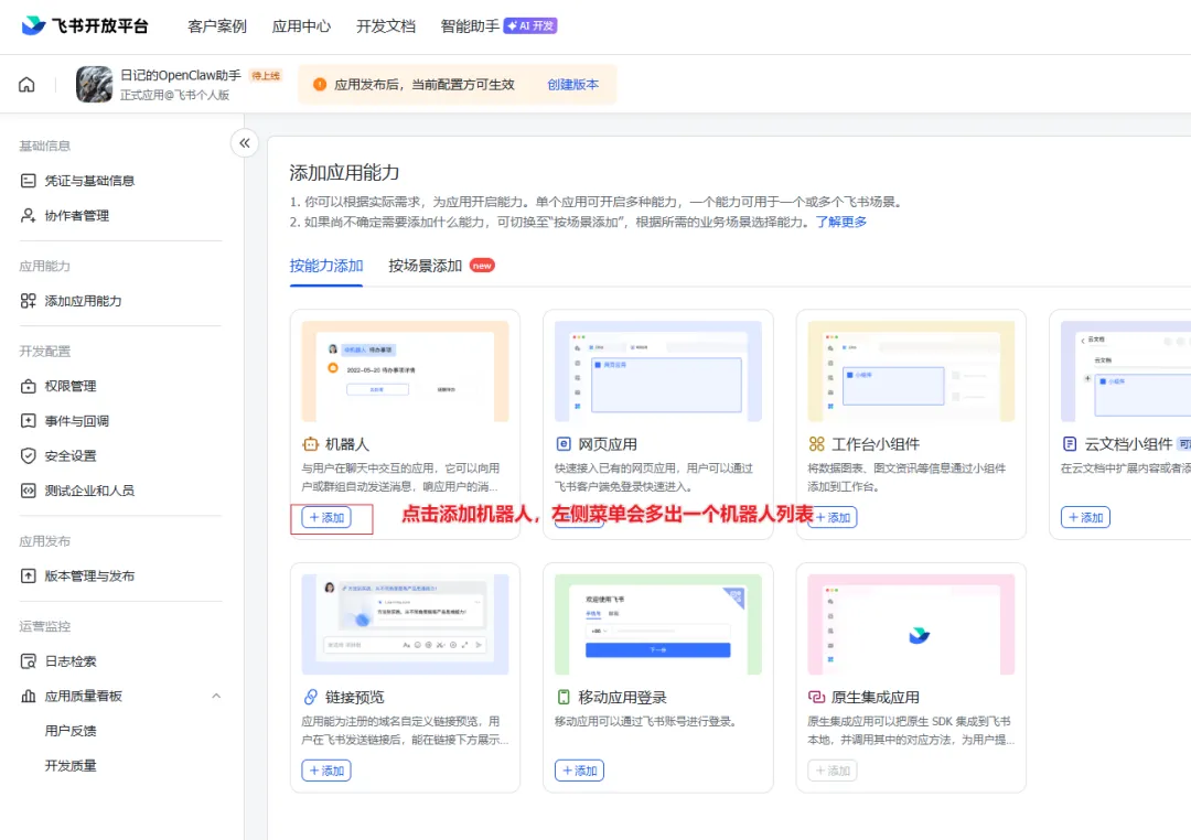 说明:接入AI模型后,我们可以通过OpenClaw网页跟AI进行交流,但想通过飞书跟OpenClaw进行交流,还差一步,配置飞书