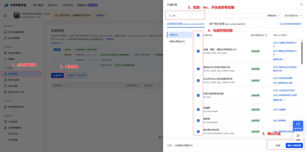 4、配置权限:点击左侧【权限管理】,在【开通权限】搜索框中输入:im:,然后将所有出现的权限全部勾选,点击【批量开通】