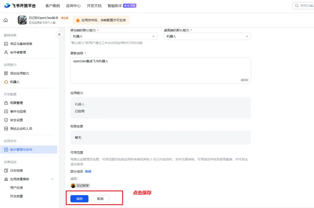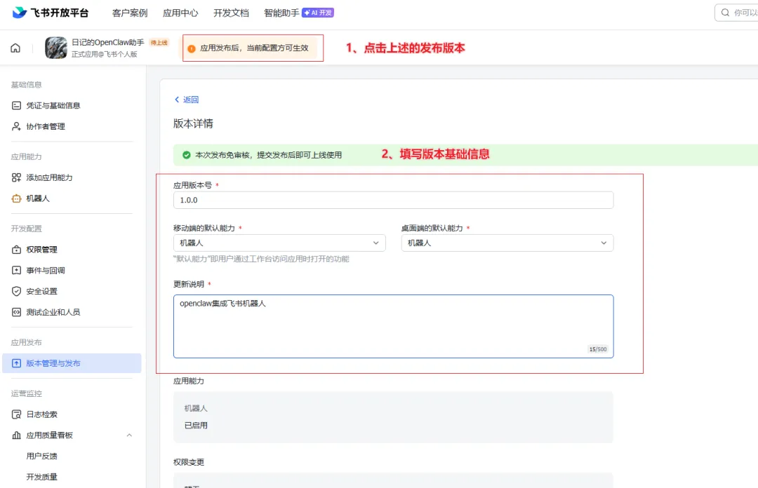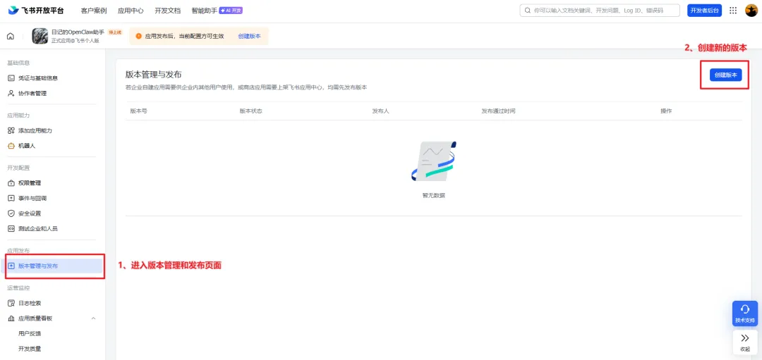 5、发布版本:进入【版本管理和发布】 =》 【创建版本】,填写版本信息,点击【保存】