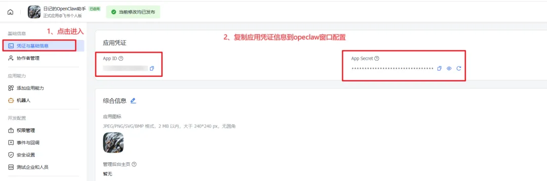 8、不关闭窗口,回到【飞书开发者后台】,找到应用,进入【凭证和基础信息】菜单,获取App ID和App Secret,输入到终端界面