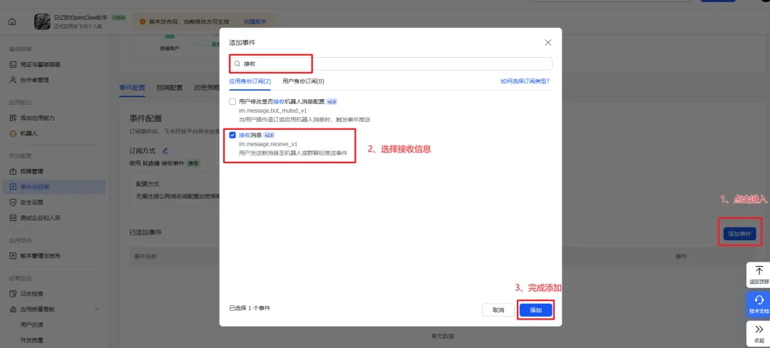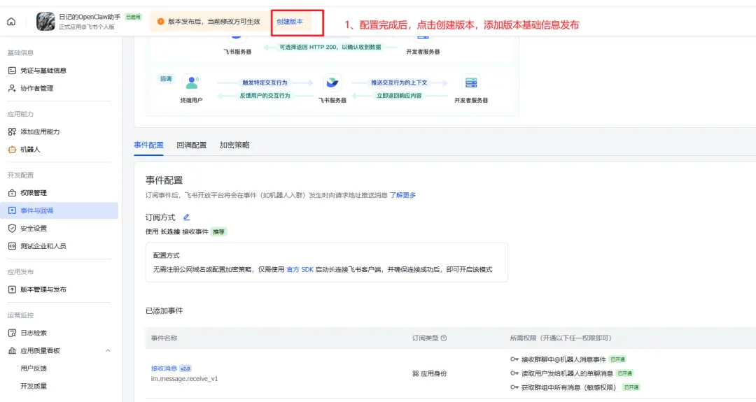 12、进入【飞书开发者后台】,配置订阅方式为【长连接】