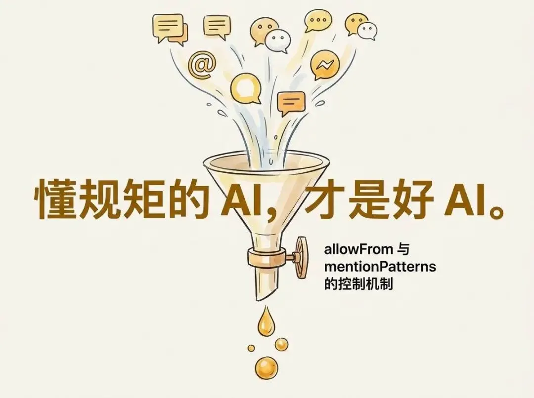一个 Gateway 进程,WhatsApp、Telegram、Discord 全能接。更关键的是,它支持细粒度的“入口治理”。你可以设置 allowFrom(谁能用)、requireMention(必须艾特才理你)。这就好比给你的 AI 助理立了规矩:不叫你,你就给我老实待着;叫你,你再出来干活。