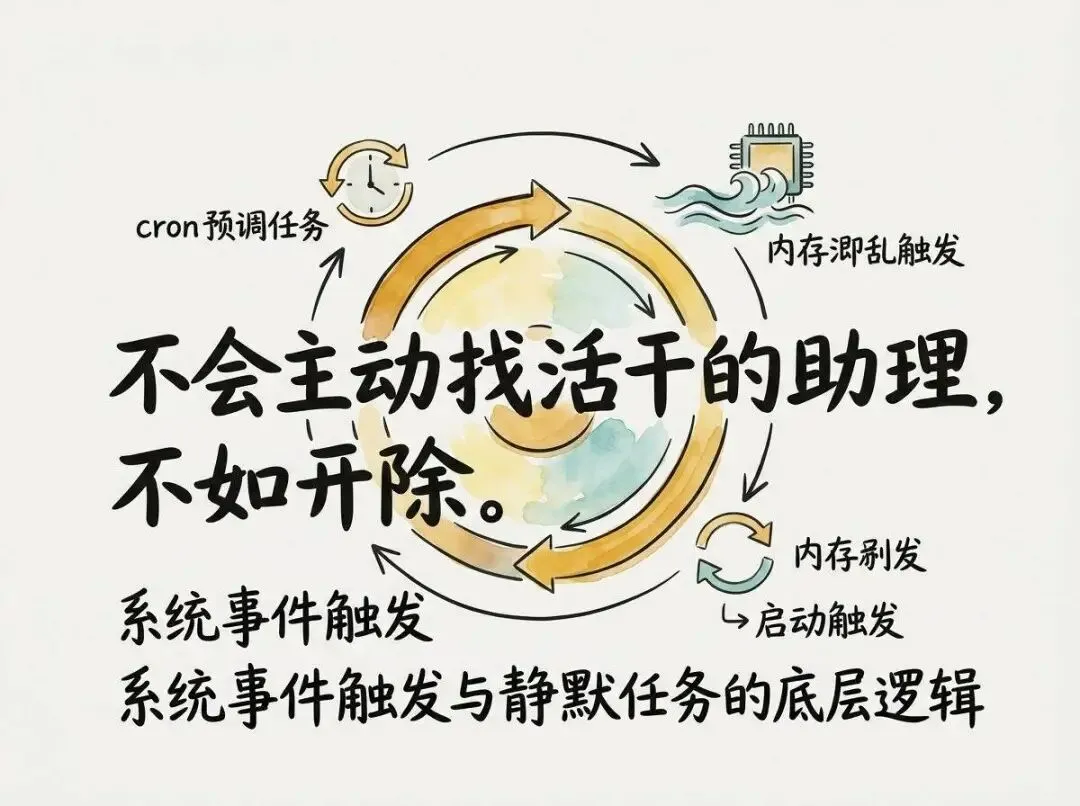 但我想要的是个助理,不是个算盘啊!OpenClaw 内置了 cron 定时任务,还能根据系统事件(比如内存快满了要压缩时)自动触发静默任务。