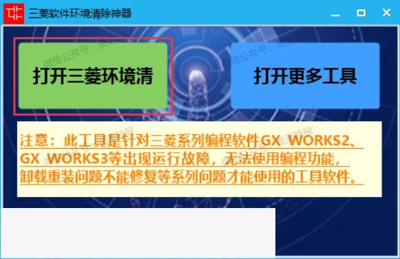 此工具是针对三菱系列编程软件GX WORKS2、GX WORKS3等出现运行故障,无法使用编程功能,卸载重装问题不能修复等系列问题才能使用的工具软件。