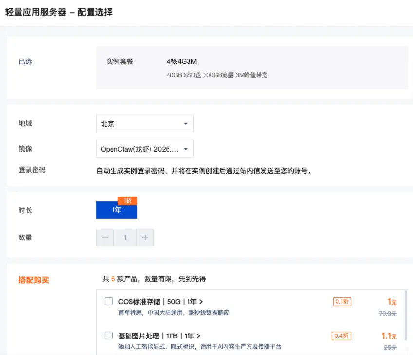 我这里选择的是腾讯云主机,在选择镜像时,直接选择最新的OpenClaw镜像,我这里选用4核4G的云服务器。