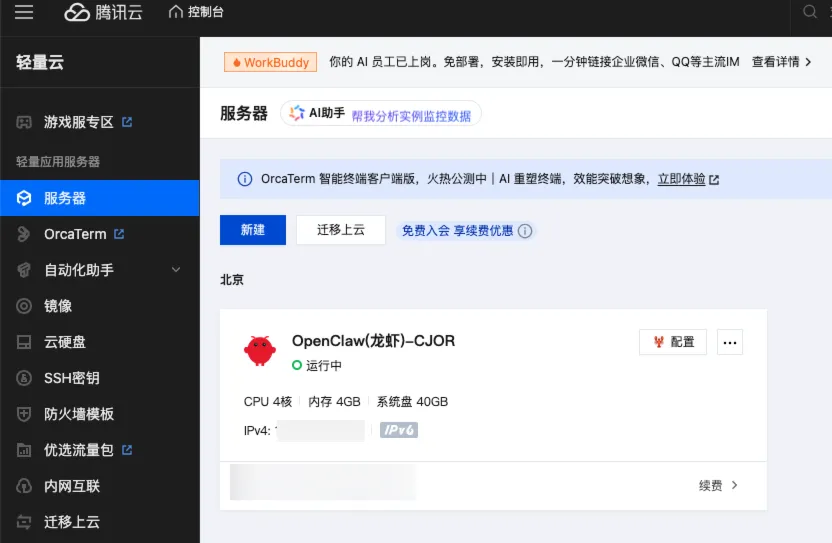 购买后,来到控制台页面,就可以看到我们购买的服务器。