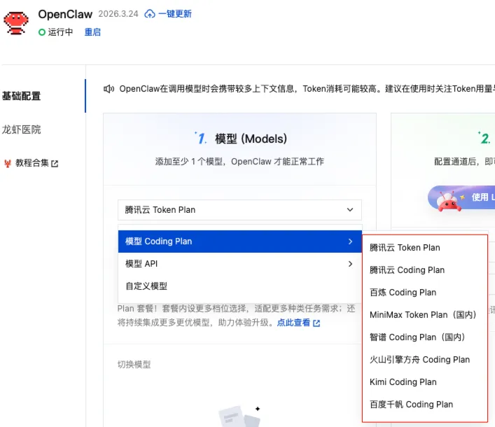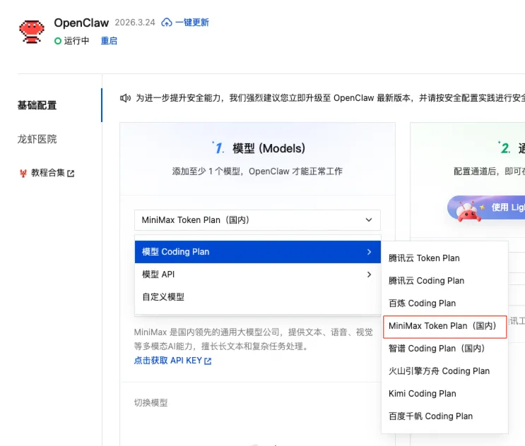 回到腾讯云OpenClaw配置界面,在模型配置里选择“模型Coding Plan”,然后选“MiniMax Token Plan(国内)”。