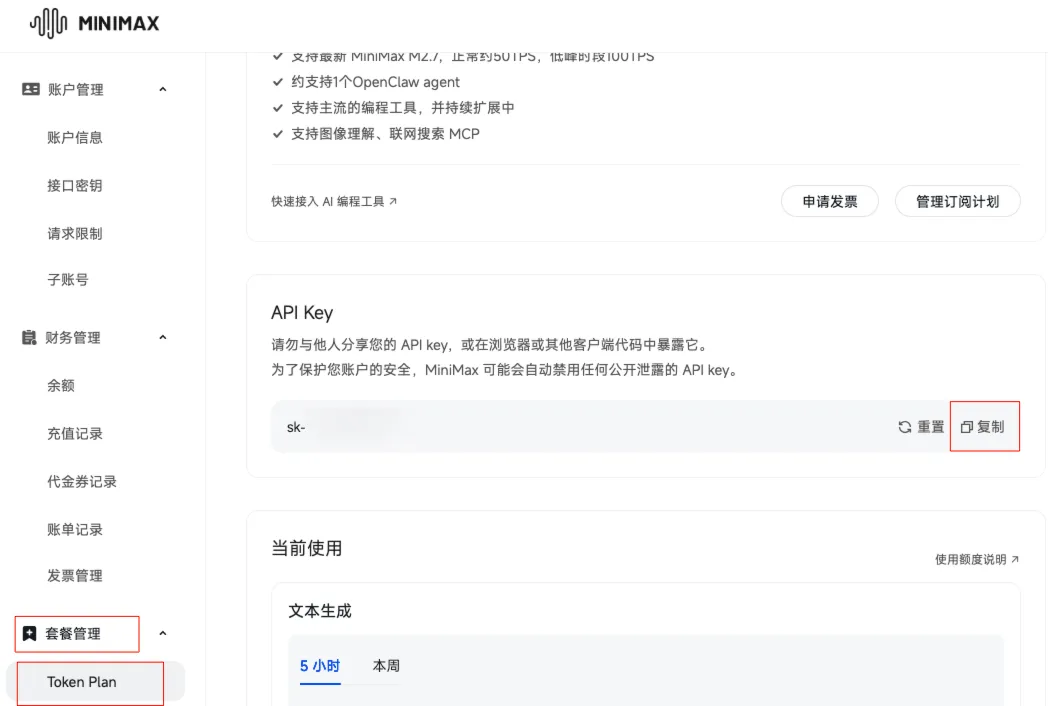 购买完成后,在套餐管理-Token Plan中,直接复制API Key。
