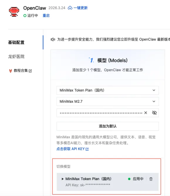 把刚才复制的API Key填进去,点击“添加为默认”。
