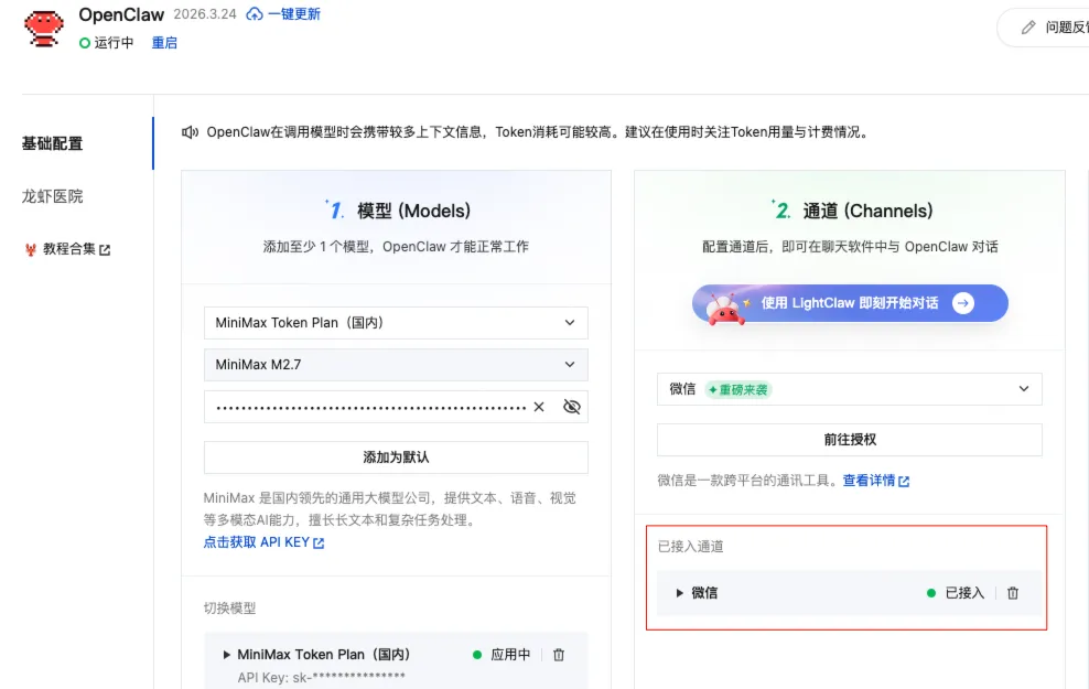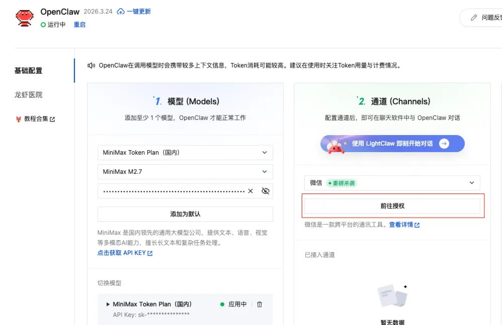 接下来,我们把龙虾接入到微信中,点击“前往授权”,通道选择微信,注意,在对接前,要把手机微信更新到最新版本。