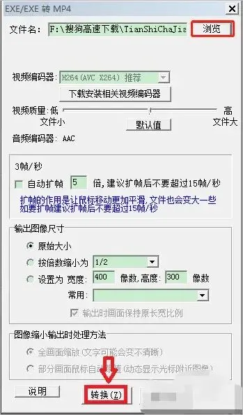 打开软件,点击菜单栏的 转换工具,选择 EXE/LXE 转 MP4 或其他格式。在弹出的窗口中点击 浏览,选中要转换的 EXE 文件,其他选项保持默认,点击 转换。