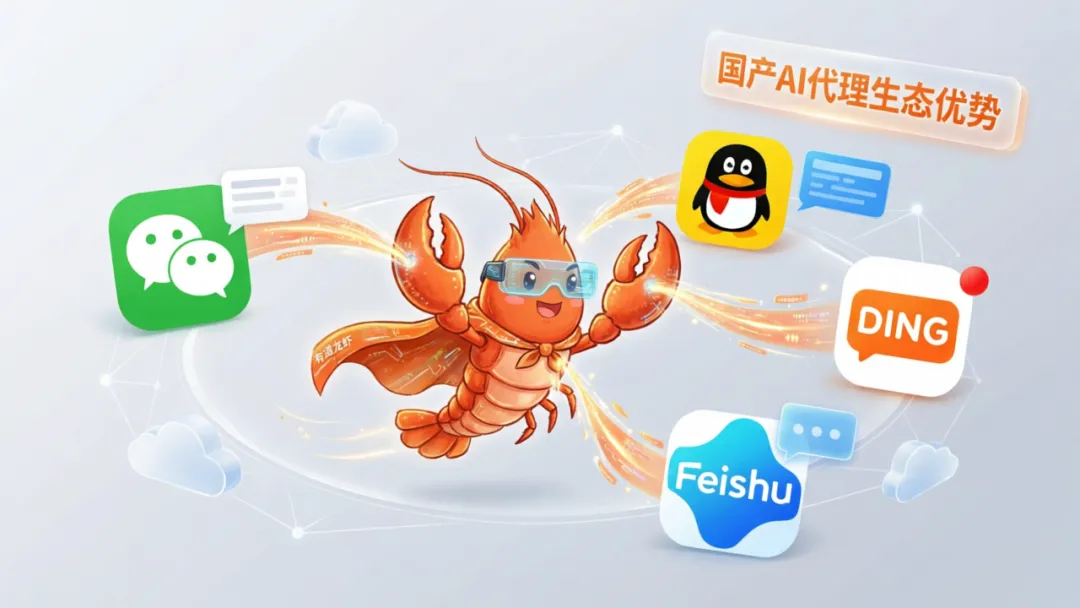 ▲ ▲ 有道龙虾全平台接入场景,微信、QQ、钉钉、飞书同时集成,国产AI代理生态优势,插画风格,橙色主题