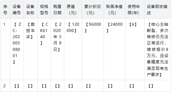 另外,“设备现状描述”要具体,不能只写“损坏”,要写清“哪个部件损坏”“损坏程度”“是否能维修”,比如“空压机主机磨损严重,排气压力无法达到0.8MPa,维修需更换主机,报价3万元,设备净值2.5万元”,比笼统表述更有说服力。